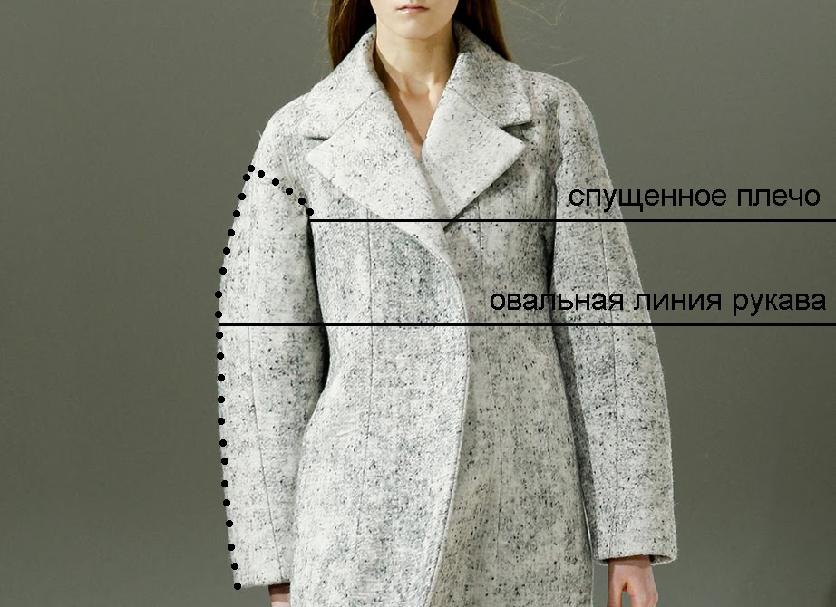 Линия плечевого шва, например, заметно отклоняется от естественной линии плеча, скользит вниз, к спущенному рукаву, и вверх, к поднятому воротнику.